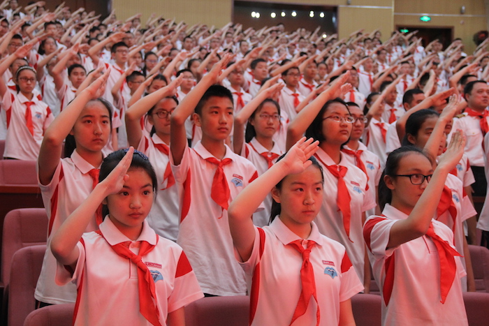无论当年戴上红领巾的我们是多么的骄傲,自信,然而现在的我们也已经步入了青年时期,我们不再是孩童。当我们最后一次举起右手庄严宣誓,嘴里念的是中国少先队的誓词,那一刻,我们真的准备好了。舒缓的乐声中,我们行了人生中最后的队礼,摘下了陪伴8年的红领巾,写下这一特定时期青春的誓言,再把它整齐地放进礼盒,保存下最美的记忆。这其中包含有不舍,有感动。要谢谢红领巾这些年带给童年的温暖,如同它鲜艳的色彩,永远温暖在心中,温暖在记忆里。是否童年的秋千还在草地旁随风摇曳,是否童年的你在操场上留下的欢笑至今仍然回荡,是否当我们写下青春宣言的一瞬间,心中的热情如火焰般喷发。今后的路还长,而我们,一定会坚实地走下去。