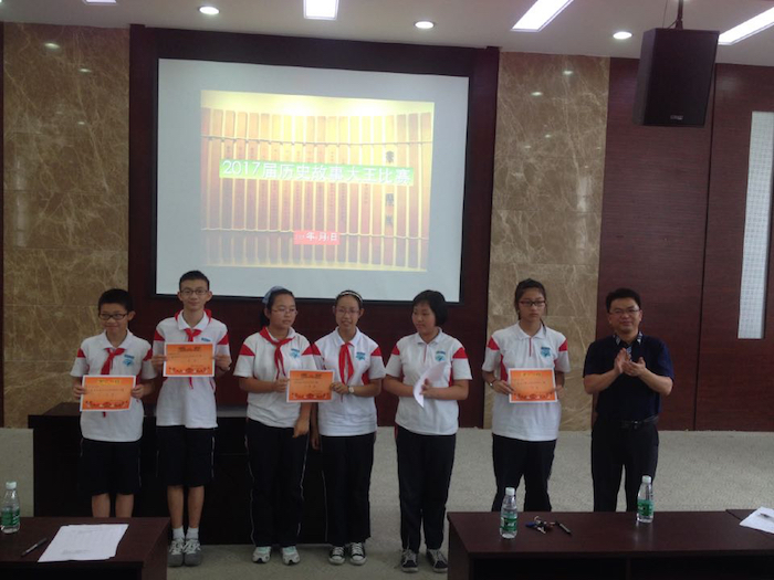 最终初一八班的梁思睿同学获得了本届的“历史故事大王”称号,得到了精美历史书籍。