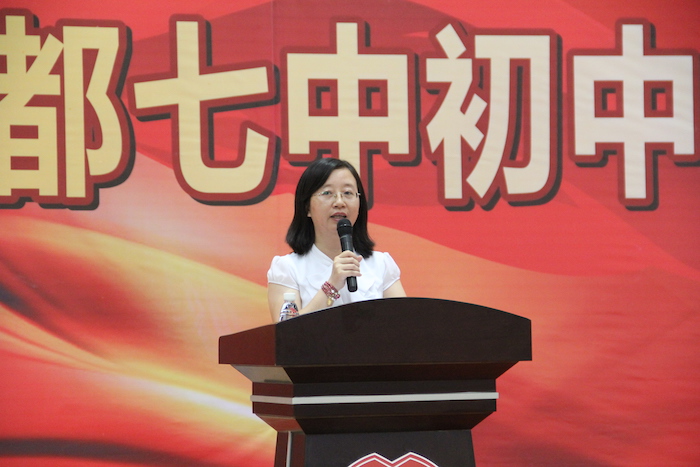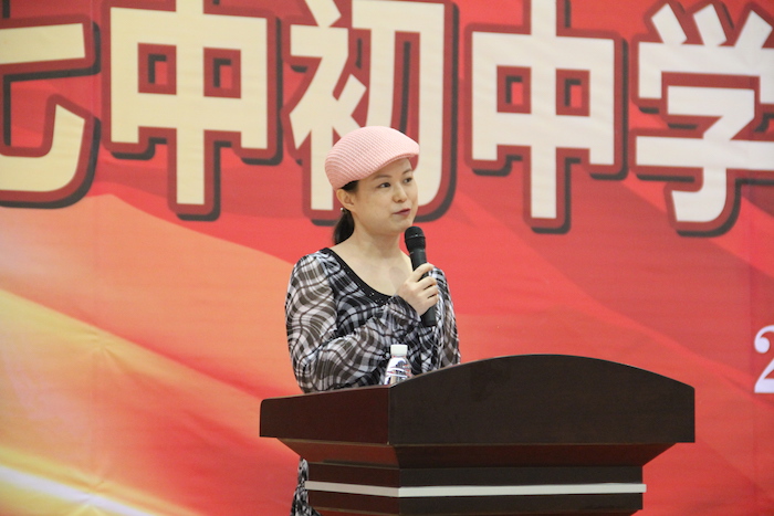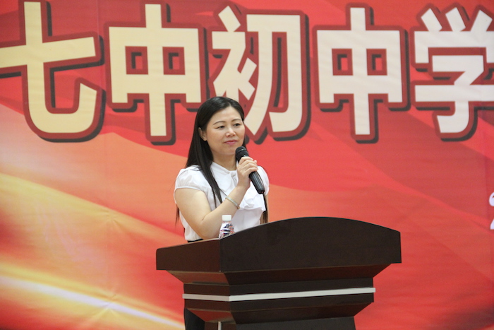 最后,李笑非校长致辞。她为家长介绍了七中初中学校的办学理念,并汇报近些年取得的优秀的办学成绩。她指出奥运的“标准”“境界”“态度”“信念”“胸怀”七中初中人也有。七中初中是七中初中人的思维理念,是言谈举止坚守的标准,是追求卓越的境界,是处世严谨的态度。