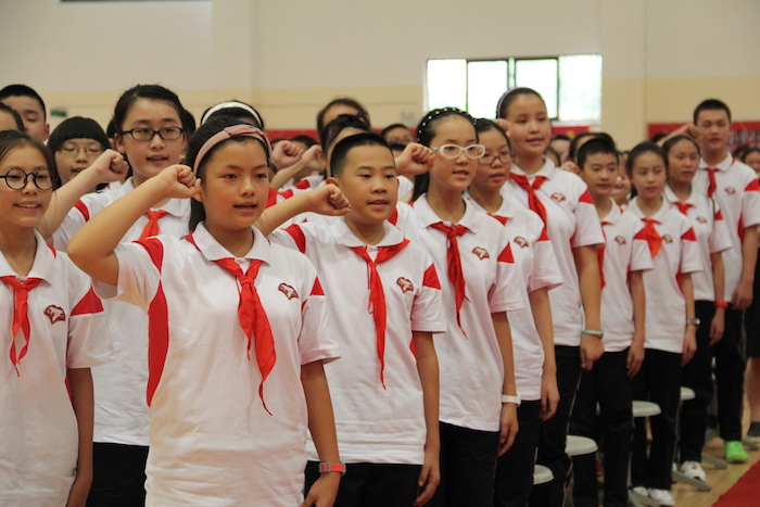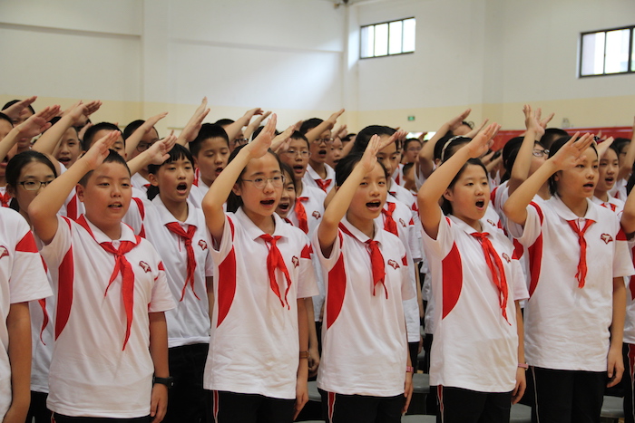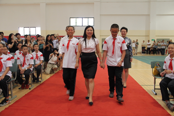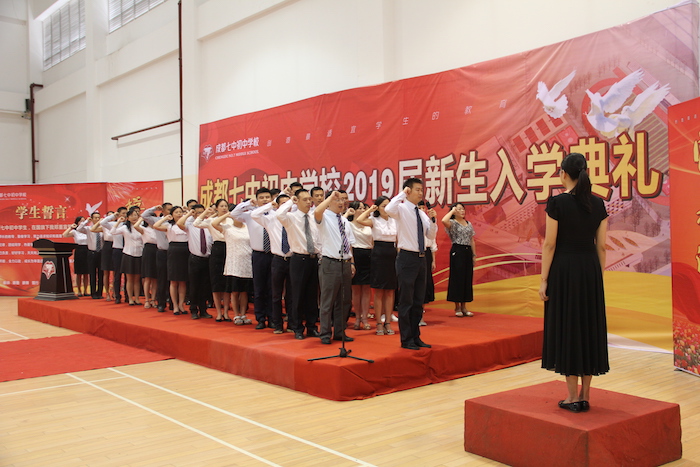奏唱国歌后,李笑非校长郑重地从家长手中接过两个新生交给2019届年级组长何明老师。这不仅仅是在完成一个简单的交接,这是成都七中初中学校对所有孩子、所有家庭乃至对社会、对国家的庄严承诺!荣誉与责任并存,老师们在此刻庄严宣誓。年级组长何明代表2019届老师发言,他希望新的同学在三年的初中生活中无惧困难,珍惜时光,落实行动,乐于交往。
