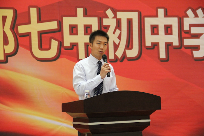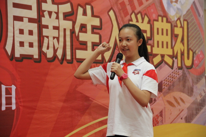 接着,2019届11班学生陈沛锦作为学生代表发言。他认为进入七初学习很幸运,同时要更努力,更幸运,在七初踏上一条艰苦奋斗的成功之路。