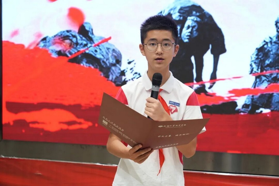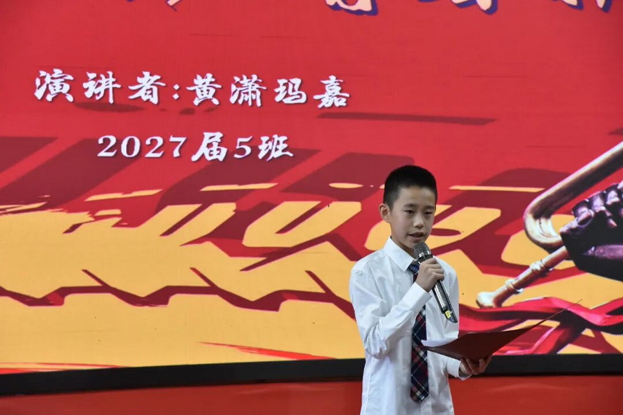 2027届9班的王辰曦同学讲述了英雄的伟大事迹和现代科技的欣欣向荣,并号召同学们勿忘国耻,强国有我!