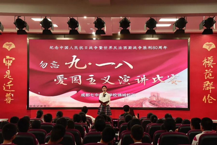 纪念“九一八”爱国主义演讲比赛也在锦城校区同步举行。锦城校区的比赛由2027届9班晋思琪同学主持。